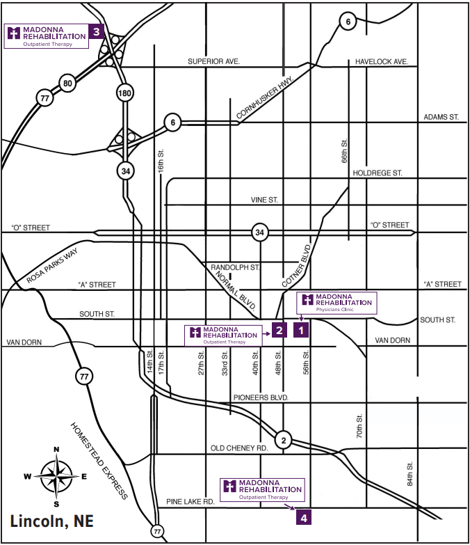 East of Madonna Rehabilitation Hospital on South St.
